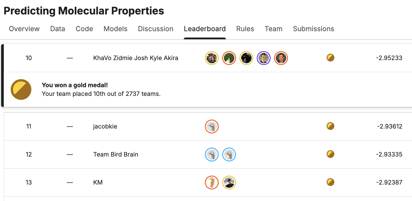 I’m proud lead a team of 5 to achieve a GOLD medal (rank 10/2737 teams) in a fairly prestigious world-class Predicting Molecular Properties challenge.