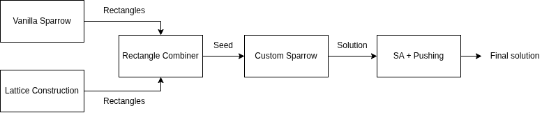 Warm-start: allow to pass along an initial solution for sparrow to start from: We extended Sparrow to accept an initial solution, allowing it to warm-start from previously obtained layouts. This enabled us to seed Sparrow with the diverse solutions produced by the rectangle combination algorithm.
